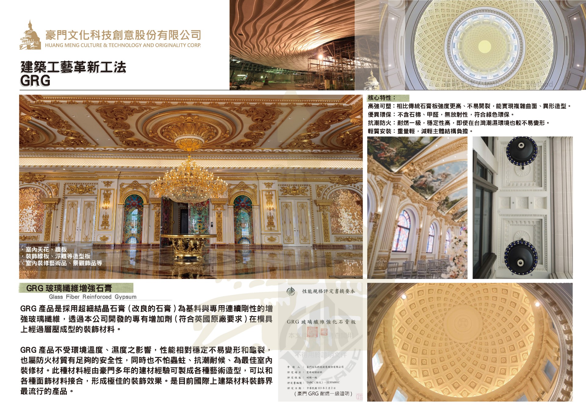 GRG產品不受環境溫度、濕度之影響,性能相對穩定不易變形和龜裂,也屬防火材質有足夠的安全性,同時也不怕蟲蛀、抗潮耐候、為最佳室內裝修材。此種材料經由豪門多年的建材經驗可製成各種藝術造型,可以和各種面飾材料接合,形成極佳的裝飾效果。是目前國際上建築材料裝飾界最流行的產品。